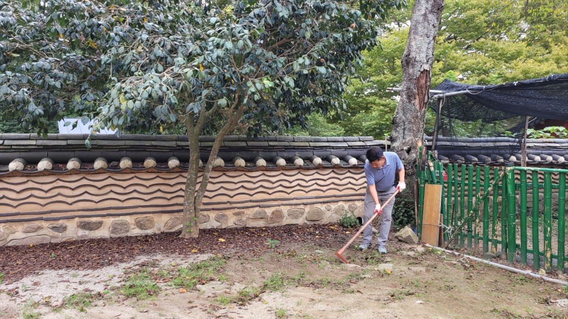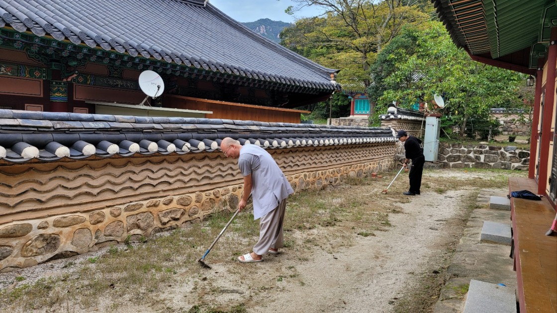 도갑사 스님과 함께 종무원들이 깨끗한 도량을 위해 풀뽑기 울력을 진행하고 있습니다.